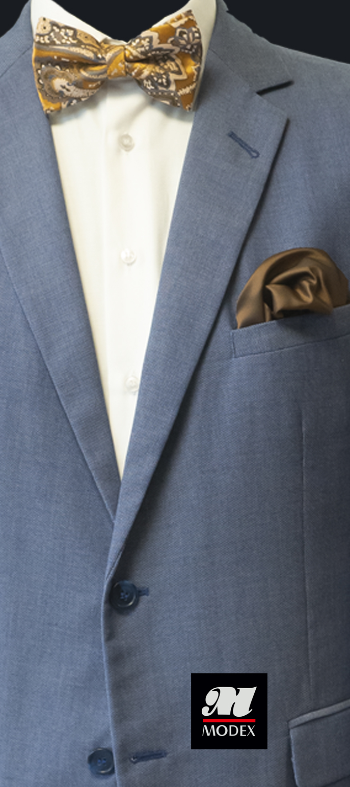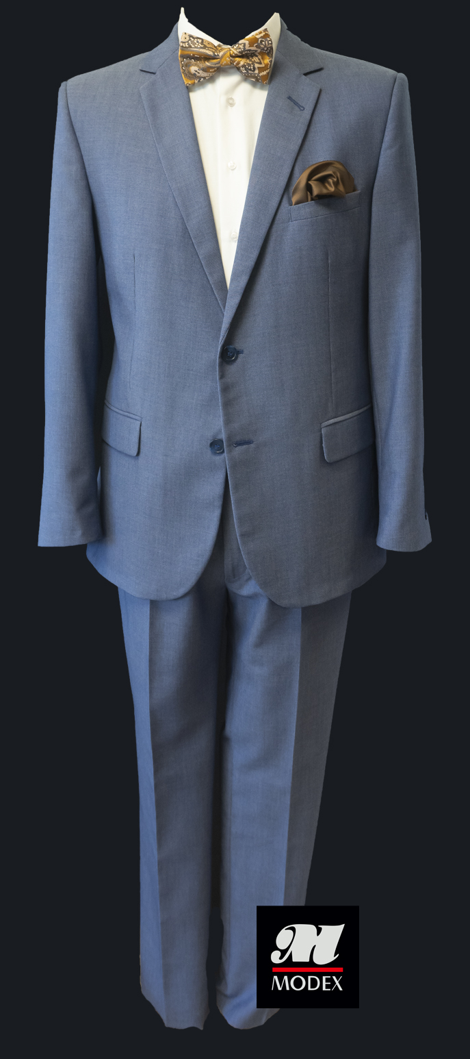 Garnitur w jasnoniebieskim odcieniu z delikatnej tkaniny, taliowany z dwoma rozcięciami z tyłu.
